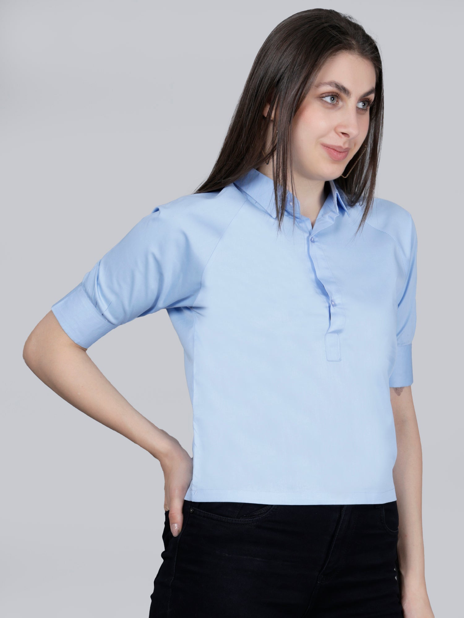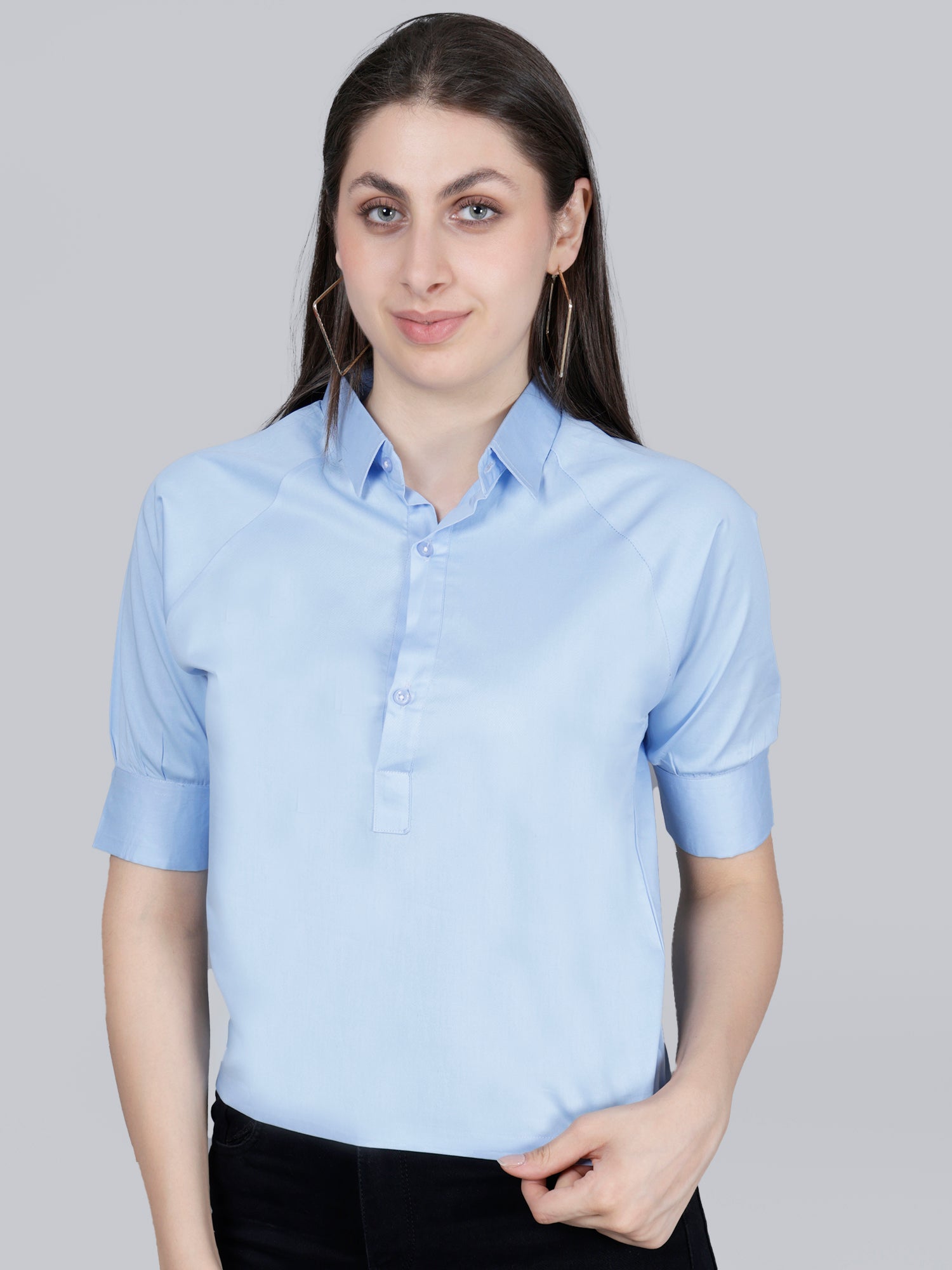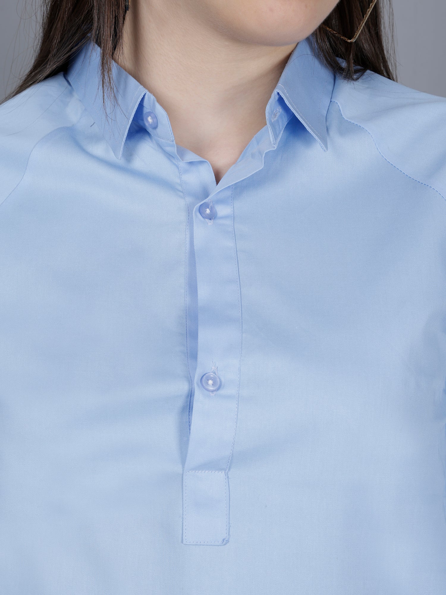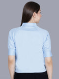 Vaijal Women's Casual 3/4 Sleeve Slim Fit Spread Collar Solid Cotton Blue Top